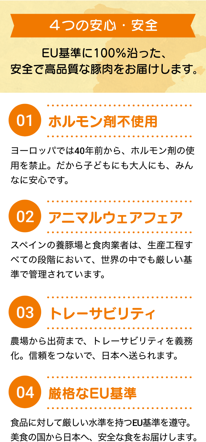 豊かな文化が息づく美食の国、スペイン。伝統的な郷土料理から現代的な創作料理まで、多彩な食を楽しめるスペインは、高品質な豚肉の生産でも広く知られています。 スペインポークは、その優れた安全性と深い味わいが特徴で、多くの国々で親しまれており、日本への輸出も増えてきています。スペインポークの魅力を、ぜひご堪能ください。