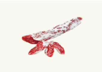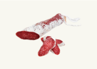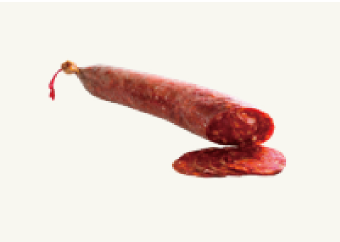 いわゆるサラミ。ミンチした豚肉に脂身を加えた大きめの腸詰製品。大きな特徴は、パプリカパウダーを使⽤せず、塩と胡椒のみを使用します。どちらかというと⼤⼈向けのテイスト。